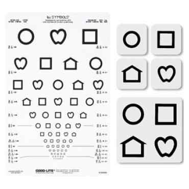 Proportionally spaced (logMAR); line sizes range from 20/125 to 20/8 (6/38 to 6/2.4) equivalent, 0.16 to 2.50. This chart can either be wall mounted or used in an ESV1200 or Model A+ illuminated cabinet. Includes response key, training cards, and instructions.