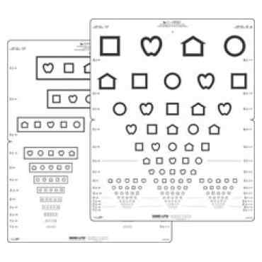 Pediatric distance visual acuity eye chart featuring LEA SYMBOLS® for screening or testing individuals beginning at age 2 1/2. This eye chart folds in half for added mobility or easy storage. Front side of eye chart features pediatric symbols in proportionally spaced lines (ETDRS format) for monocular (testing one eye with the other eye occluded) and binocular (testing both eyes simultaneously) visual acuity testing or screening. The opposite side, features pediatric symbols in the Massachusetts Visual Acuity Format for both left eye and right eye testing.