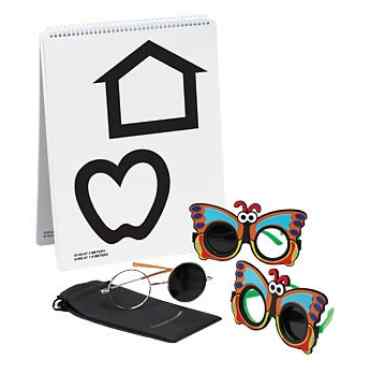The LEA SYMBOLS® low vision booklet can be purchased with binding either on the left side or top. The booklet can also be purchased alone or part of a set that includes butterfly occluder glasses for children and metal frame occluder glasses (shown).