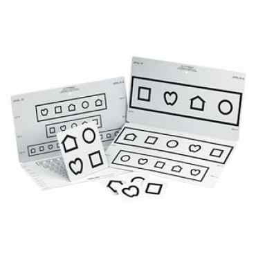 Pediatric distance vision chart with LEA SYMBOLS® pediatric symbols for screening or testing individuals beginning at age 2 1/2. 50% spaced rectangle (Massachusetts Visual Acuity Test format) with line sizes from 20/200 to 20/8 (6/60 to 6/2.4) equivalent. Has hole for hanging the chart on the wall. Includes response key, flash cards, and instructions. 18" x 20" (45.7 cm x 50.8 cm). Folds to 18" x 10" (45.7 cm x 25.4 cm)