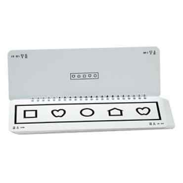 Handheld pediatric vision chart with LEA SYMBOLS® is designed for amblyopia testing or screening. 50% spaced rectangle (Massachusetts Visual Acuity Test format) with line sizes from 20/80 to 20/16 (6/24 to 6/4.8) equivalent. Pages are offset for easy flipping. Includes response key and flash cards. 10 pages, 3.25" x 9" (8.25 cm x 22.9 cm).