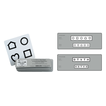 Handheld flip chart featuring LEA SYMBOLS® and HOTV optotypes to screen 3 and 4+ year olds. The background is gray with the exception of a white rectangle spaced at 50% surrounding each line of symbols. Contains one practice line of 20/80 and critical line sizes of 20/40 and 20/32. Pages offset for easy flipping. 6 pages, 3.25" x 9" (8.25 cm x 22.9 cm).