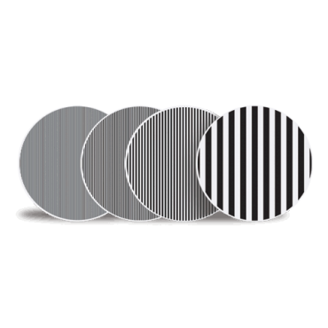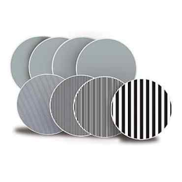 This test at full contrast requires discrimination of the direction of long lines, which is a more demanding task than the detection acuity measured with Lea GRATINGS. The test gratings are presented to children and adults at different distances to determine which distance the direction of lines can be perceived. Knowing the distance and which grating was used, the grating acuity values can be read from the nomograms. Includes, nomograms, instructions and storage case. 4 disks 8" (20 cm) in diameter.