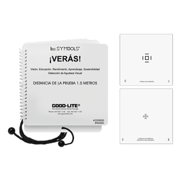 Veras Spanish Screener Book for 5 feet (1.5 meters) with LEA SYMBOLS® pediatric symbols. Includes response key, and training cards. 13 offset pages for easy flipping. 6.25" x 6.5" (15.9 cm x 16.1 cm).