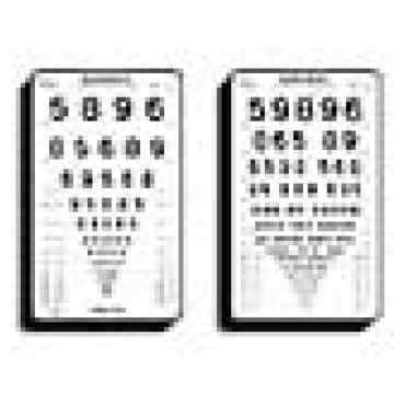 This test is designed for testing patients’ visual acuity during rounds and in similar situations with a need for quick testing. The test has proportionally spaced (logMAR) lines on one side and tightly crowded lines (50% spacing) on the reverse side Line sizes from 20/400 to 20/10 (6/120 to 6/3) equivalent, 0.05 to 2.00. 3.75" x 6.25" (9.5 cm x 15.9 cm).