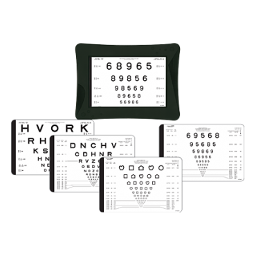 Near Vision Illuminated charts with Sloan Letters, LEA SYMBOLS, and LEA NUMBERS with optotypes ranging from 20/250 to 20/10 (6/75 to 6/3) equivalent. Testing distance is 16"/40cm.