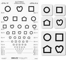 Proportionally spaced (logMAR); line sizes range from 20/125 to 20/8 (6/38 to 6/2.4) equivalent, 0.16 to 2.50. This chart can either be wall mounted or used in an ESV1200 [1] or Model A+ [2] illuminated cabinet. Includes response key, training cards, and instructions.