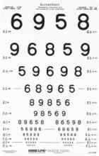 Proportionally spaced (logMAR); line sizes range from 20/100 to 20/8 (6/30 to 6/2.4) equivalent, 0.20 to 2.50. This chart can either be wall mounted or used in ab ESV1200 [1] or Model A+ illuminated cabinet.