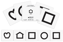 These five LEA SYMBOLS® Cards can be used for presentation as single optotypes or arranged in a row as a line test. When the cards are next to each other, the space between the symbols is equal to the width of the symbols. To determine the visual acuity use the following formula: