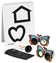 The LEA SYMBOLS® low vision booklet can be purchased with binding either on the left side or top. The booklet can also be purchased alone or part of a set that includes butterfly occluder glasses for children and metal frame occluder glasses (shown).