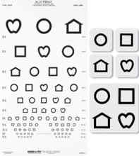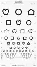 LEA SYMBOLS® pediatric eye chart with proportionally spaced (logMAR) lines; line sizes range from 20/80 to 20/8 (6/24 to 6/2.4). This chart can be used in Good-Lite's illuminated ESV1018 or hung on the wall. Chart size 10" x 18" (25.4 cm x 45.7 cm).