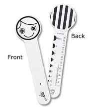 The small 2" (5 cm) diameter "smiling face" fixation paddle was developed based on studies by Robert Fanz. Features include grating on reverse side, small pictures of a bunny and a giraffe for demanding fixation, and pupil size and corneal diameter measurement on the handle.