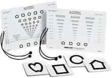 This near vision assessment has proportionally-spaced lines on one side and 50% spaced rectangle (Massachusetts Visual Acuity Test format) on the opposite side. Line sizes range from 20/400 to 20/10 (6/120 to 6/3) equivalent. Response key printed on test card. Includes flash cards and instructions. 8" x 10" (20.3 cm x 25.4 cm).