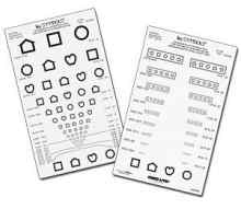 Pediatric near vision card featuring LEA SYMBOLS® pediatric symbols for testing children or illiterate adults at 16" (40 cm). It's small size makes it easy to carry or store. Front side contains proportionally-spaced lines in logarithmic progression with line sizes ranging from 20/400 to 20/10 (6/120 to 6/3) equivalent. The reverse side features pediatric symbols in 50% spaced rectangle (Massachusetts Visual Acuity Test format). Line sizes range from from 20/100 to 20/16 (6/30 to 6/4.8).