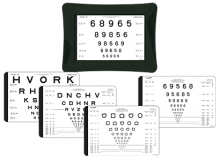 Near Vision Illuminated charts with Sloan Letters, LEA SYMBOLS, and LEA NUMBERS with optotypes ranging from 20/250 to 20/10 (6/75 to 6/3) equivalent. Testing distance is 16"/40cm.